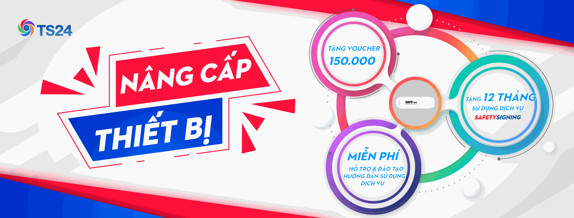 Nhằm hỗ trợ cho Doanh nghiệp đang sử dụng dịch vụ chứng thư số SAFE-CA có thiết bị USB Token V1 (màu đen) nâng cấp sang USB Token V2 (màu trắng) để có thể trải nghiệm dịch vụ "SafetySigning |Giải pháp văn phòng thông minh" , TS24 thông báo chính sách hỗ trợ nâng cấp như sau: