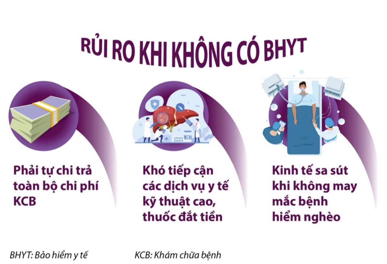 Nếu chưa tham gia BHYT, hãy cân nhắc đến các rủi ro tiềm tàng khi khám chữa bệnh vì người dân không có BHYT buộc phải tự chi trả toàn bộ chi phí khám chữa bệnh, khó tiếp cận các dịch vụ y tế kĩ thuật cao hay các loại thuốc đắt tiền vì nó sẽ làm nguồn lực kinh tế bản thân và gia đình sa sút khi tham gia khám chữa bệnh.