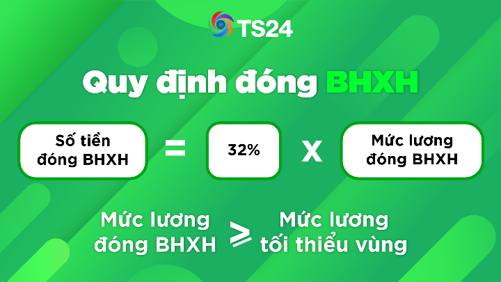 Mức đóng BHXH hiện nay là 32%, trong đó doanh nghiệp đóng 21.5% và người lao động đóng 10.5%. Mức lương đóng BHXH không được thấp hơn mức lương tối thiểu vùng và tối đa là 20 lần mức lương cơ sở.