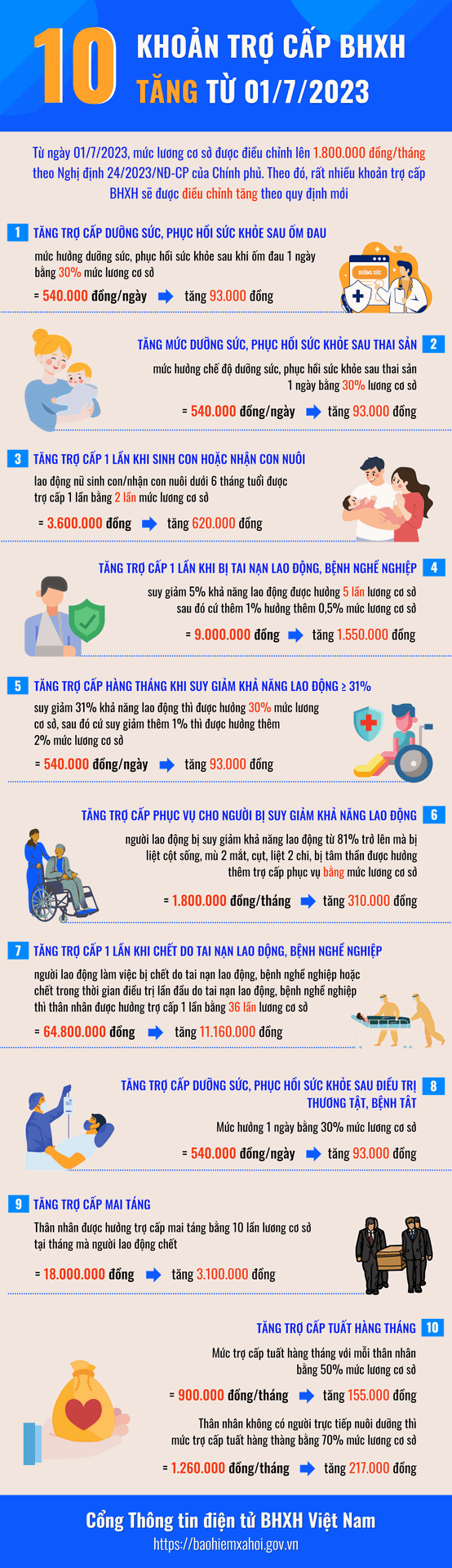 Từ ngày 01/7/2023, mức lương cơ sở được điều chỉnh lên 1.800.000 đồng/tháng theo Nghị định 24/2023/NĐ-CP của Chính phủ. Theo đó, rất nhiều khoản trợ cấp BHXH sẽ được điều chỉnh tăng theo quy định mới.