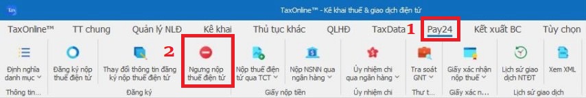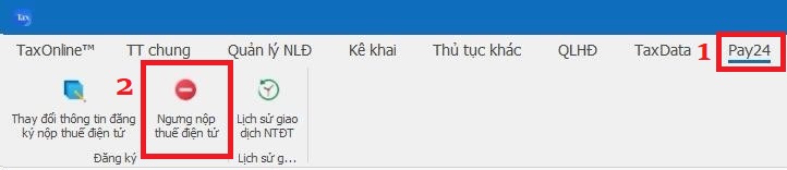Trên thanh tiêu đề chọn vào mục “Pay24” (1) > “Ngưng nộp thuế điện tử” (2).
