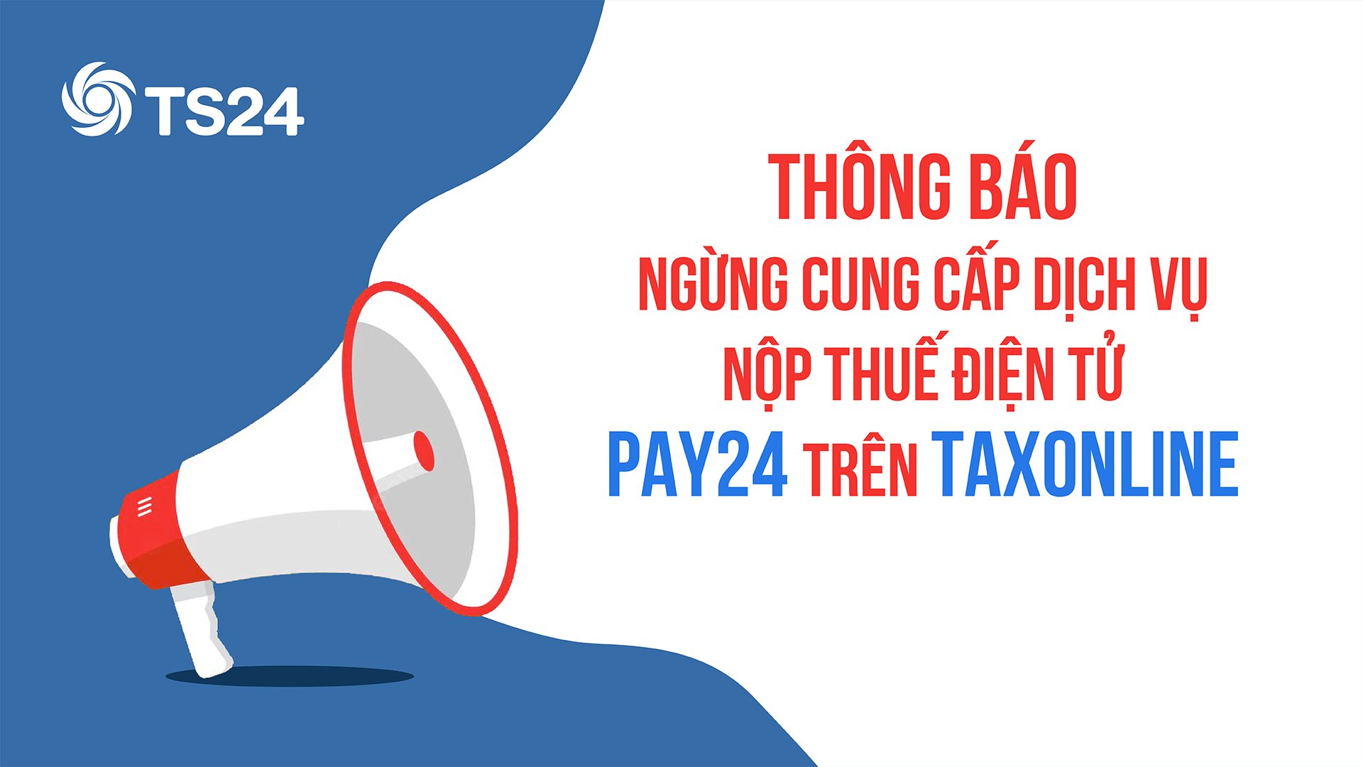 Từ ngày 12/10/2022, TS24 sẽ ngừng cung cấp dịch vụ nộp tiền điện tử Pay24 trên dịch vụ TaxOnline. Sau khi ngưng dịch vụ Nộp thuế điện tử Pay24, Quý khách hàng có thể đăng ký nộp thuế điện tử trên trang web thuedientu.gov.vn của ngành Thuế.