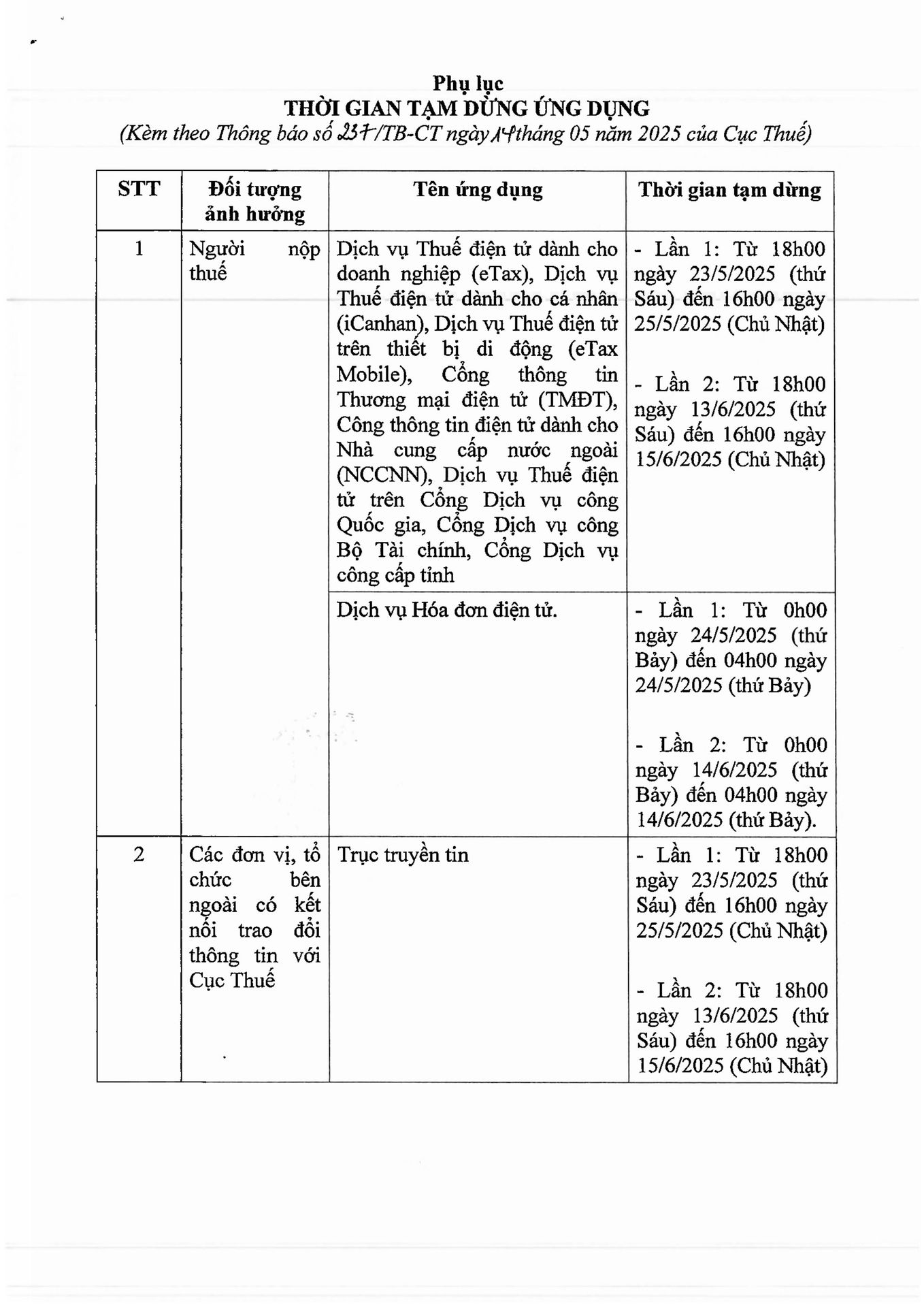 THÔNG BÁO TẠM DỪNG HỆ THỐNG NGÀNH THUẾ