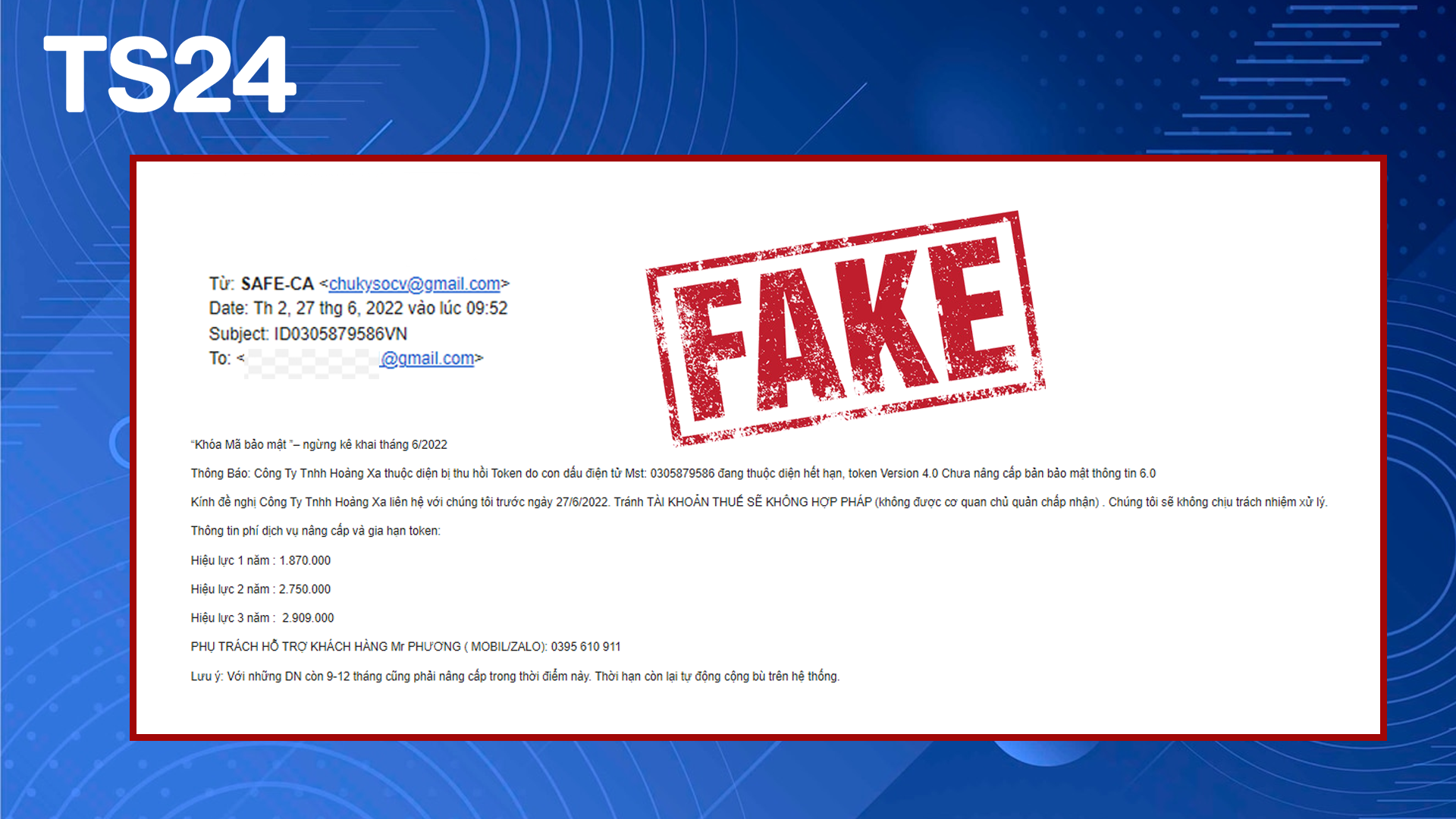 Gửi email thông báo gia hạn, nâng cấp phần mềm… mạo danh nhân viên TS24 với tên miền @gmail.com hoặc zoom.us…