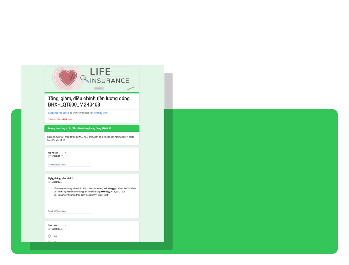 Các biểu mẫu này được thiết kế trên Google Forms theo từng Tờ khai BHXH để sử dụng cùng với File mẫu Google Sheets tương ứng trong cùng một tài khoản Google Drive.